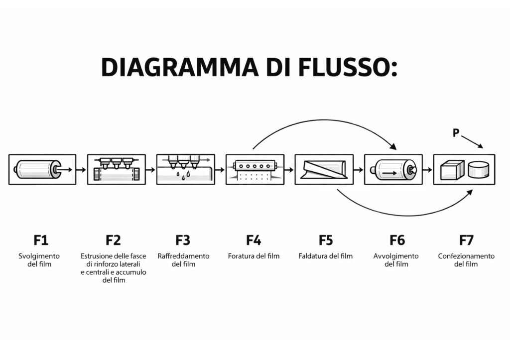 L’impianto è concepito come una linea unica completamente automatizzata, in grado di integrare in modo continuo e coordinato tutte le fasi del processo produttivo, comprendenti: svolgimento del film, estrusione e raffreddamento delle fasce di rinforzo laterali e centrali, accumulo, foratura, piegatura, arrotolamento o bobinatura e confezionamento finale.