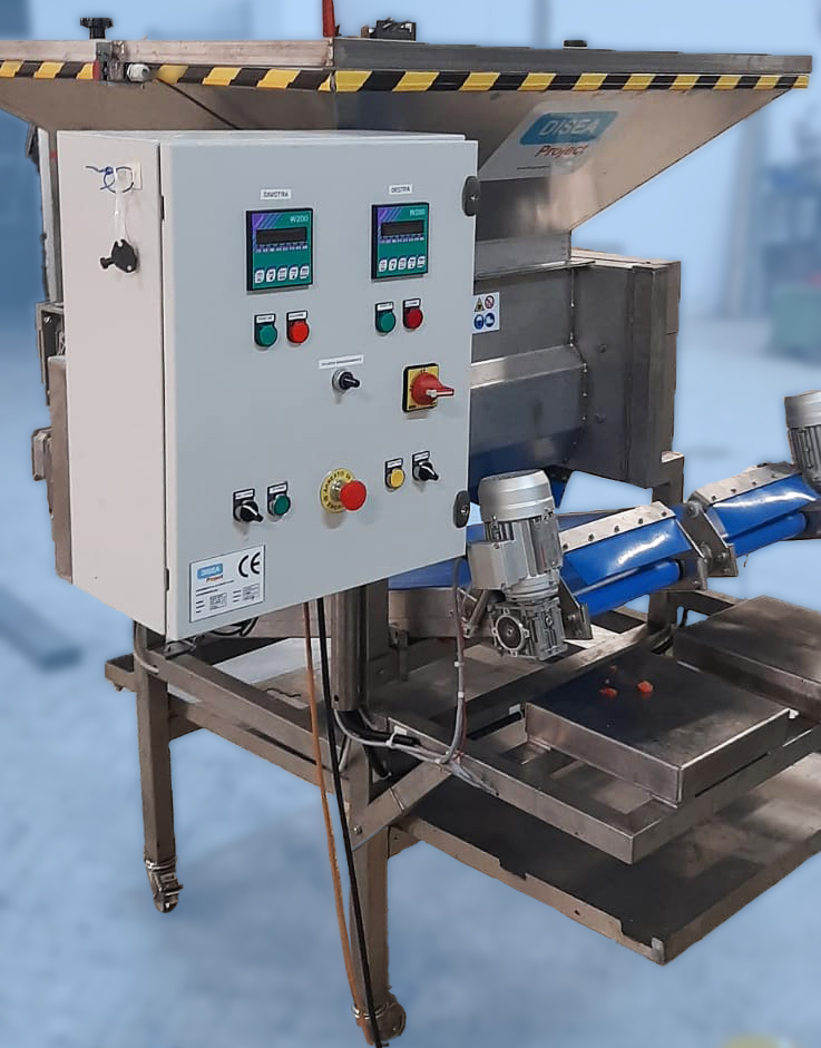 Il sistema dispone di una tramoggia nella quale scaricare i pomodori alla rinfusa all’uscita del quale il prodotto schiacciato può essere smistato su due o più sistemi di dosatura tramite peso, funzionanti in parallelo.